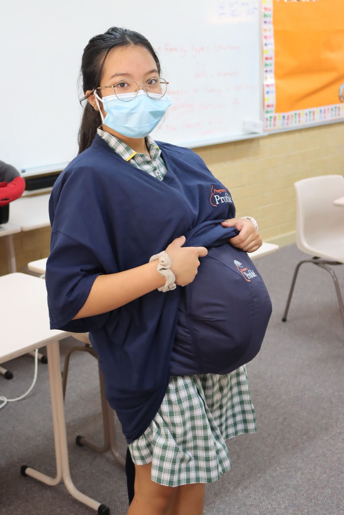 The students had to first wear a pregnancy suit and try to pick up pencils, tie their shoelaces and get up off the ground! Then they had to take their baby home for the weekend, and experience restless nights of crying, feeding, burping and changing!