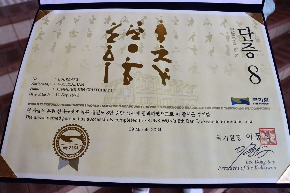 Mrs Crutchett had to sit physical and written exams in Korea in order to be awarded her 8th Dan. What an amazing honour, congratulations to Grand Master Crutchett!