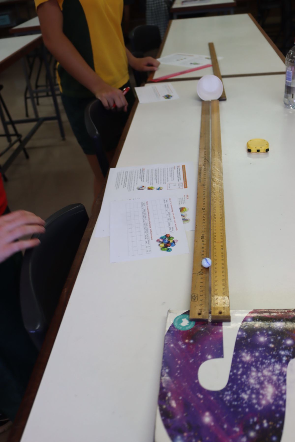 The students had to place rulers so there was a ramp, and then look at the different heights as well as what happened with a larger marble.